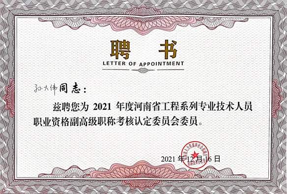 孙大伟:2021年度河南省工程系列专业技术人员职业资格副高级职称考核认定委员会委员