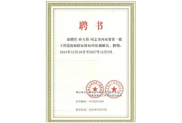 孙大伟:河南省第一批工程造价和招标投标纠纷调解员