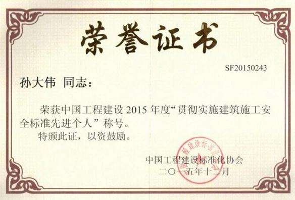 孙大伟:2015年度贯彻实施建筑施工安全标准先进个人