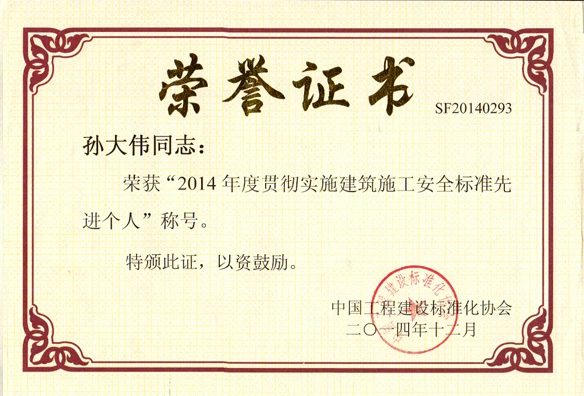 孙大伟:2014年度贯彻实施建筑施工安全标准先进个人